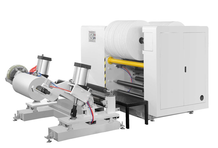 該機采用電腦控制,光電跟蹤糾偏系統(tǒng),收卷張力控制由磁粉離合器通過PLC觸摸屏實現(xiàn)自動張力控制。放卷張力由磁粉制動器、自動張力控制。收卷軸采用氣脹軸,配合自動氣壓,使收卷軸可自動升降。變頻器控制整機工作速度,配有自動計米裝置。具有切口光滑,收卷端面整齊,便于后續(xù)加工等優(yōu)點。